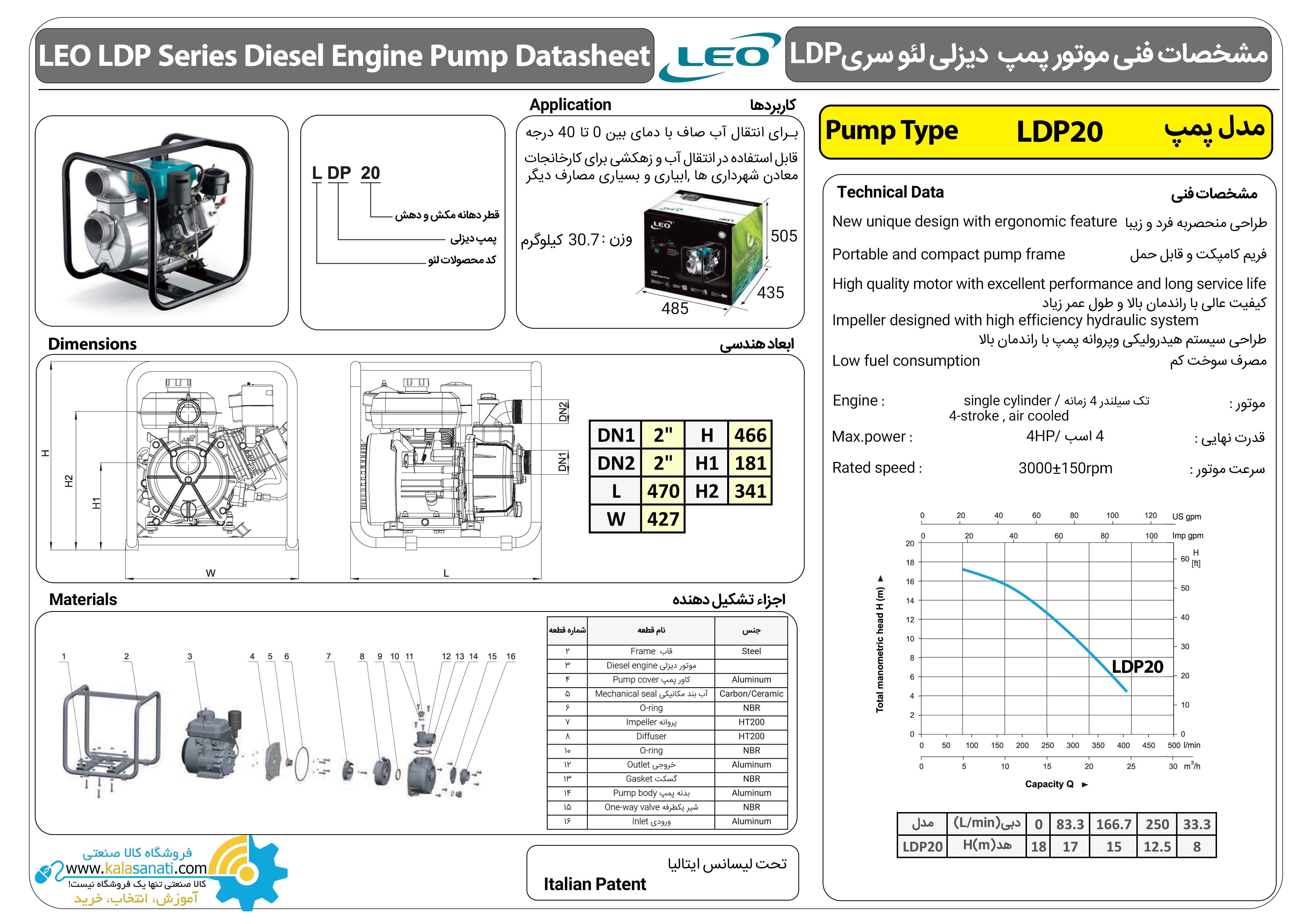 پمپ دیزلی لئو مدل LDP 20 دارای حداکثر ارتفاع هد 18 متر و بیشترین آبدهی یا دبی 400 لیتر بر دقیقه است. سایز دهانه ورودی برابر 2 اینچ است. برای مکانهایی که استفاده از برق تکفاز یا سه فاز مقدور نیست، عموماً از موتور پمپ ها استفاده می شود که موتور پمپ لئو نیز از این قاعده مستثنی نیست. علاوه بر این موتور پمپ دیزلی لئو بر روی یک شاسی استیل نصب شده که به سهولت حمل و نقل بسیار کمک خواهد کرد. پمپ های لئو سری LDP با گارانتی 12 ماهه توسط کالاصنعتی به فروش می رسند.